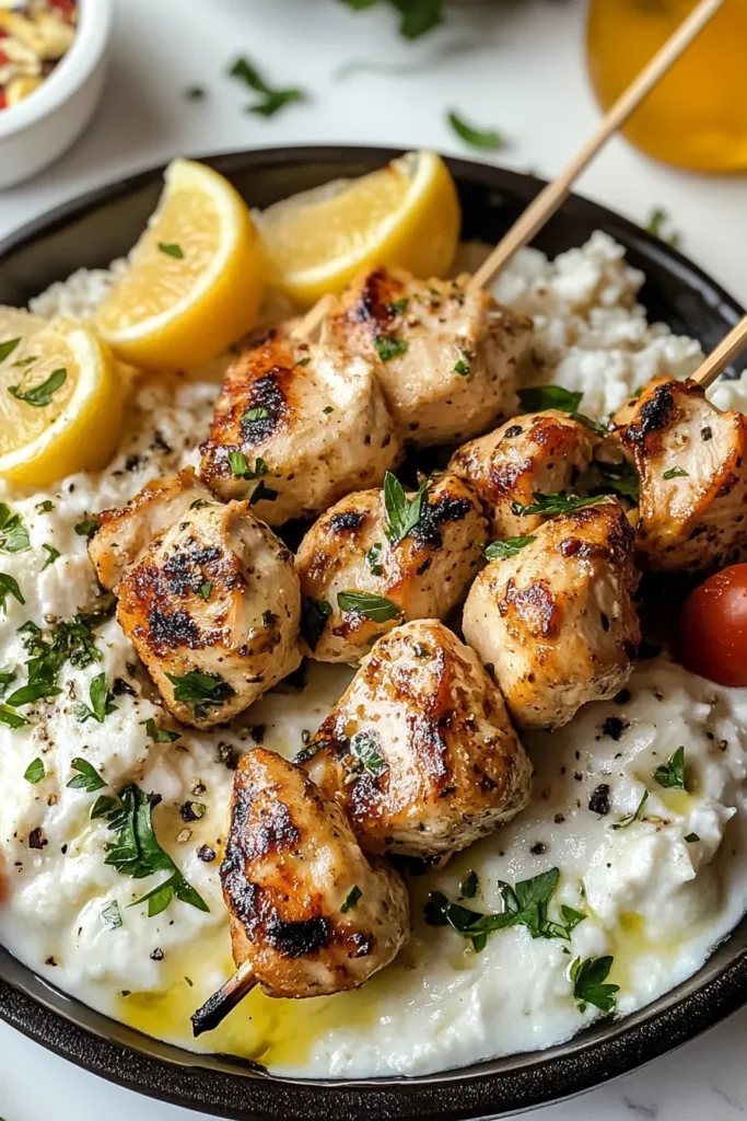 Tzatziki Sauce: A cool, creamy tzatziki is the essential companion for souvlaki. The yogurt base and cucumber cut through the richness of the grilled chicken and olive oil marinade, and the garlic in both components ties them together naturally.