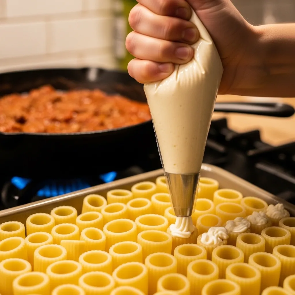Use a piping bag for cleaner filling. A zip-top bag with the corner cut works just as well, but either method is faster and less messy than spooning the ricotta into each noodle.