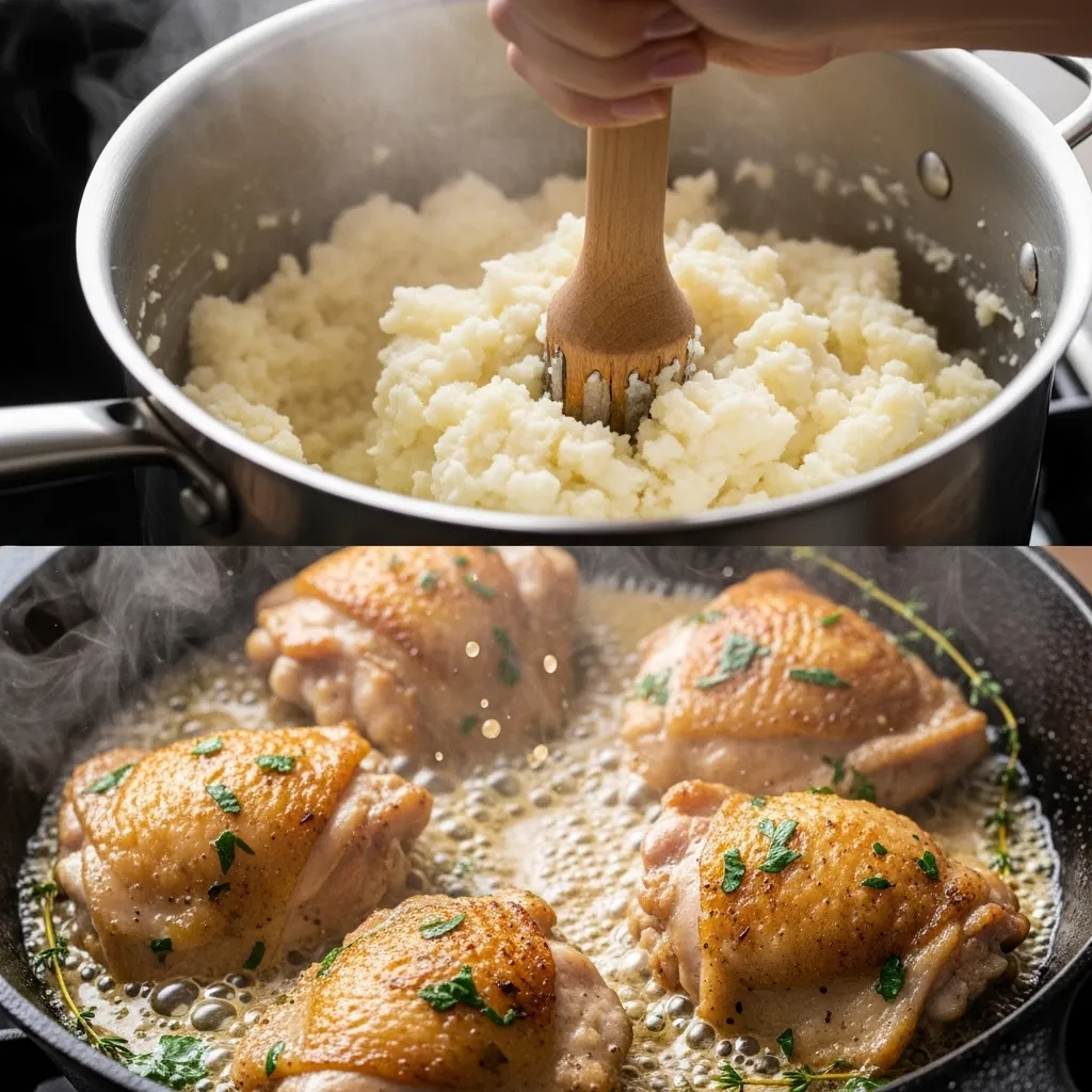 Combine & Serve: Return the chicken thighs to the skillet with the cream sauce, spooning sauce over each piece to coat thoroughly. Let them warm in the sauce for a minute. To serve, place a generous scoop of mashed potatoes on each plate. Top with a chicken thigh and plenty of cream sauce. Arrange the glazed carrots alongside. Spoon extra sauce over the potatoes so it pools around them.