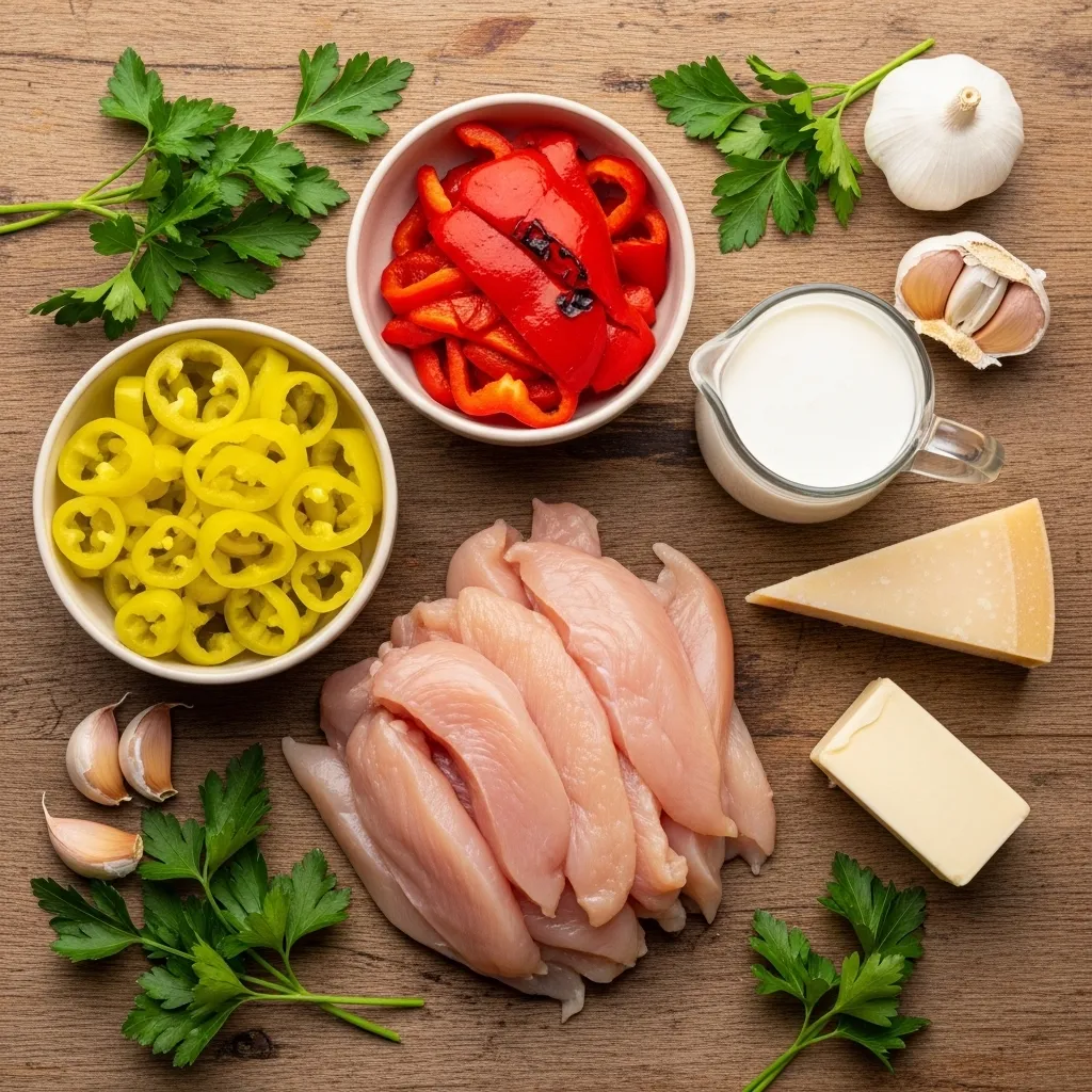 The pepperoncini peppers are what set this dish apart from standard creamy chicken recipes. Their mild, tangy heat and slight sweetness add brightness that prevents the cream sauce from feeling too heavy. Unlike spicy peppers that can overwhelm, pepperoncinis bring just enough zip to make every bite interesting without burning.