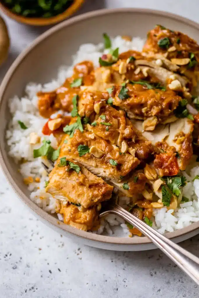 Jasmine Rice: The most natural pairing for this dish. Jasmine rice has a light floral quality that complements the coconut milk and peanut butter without competing with them. Cook it while the chicken finishes and dinner is ready in one move.