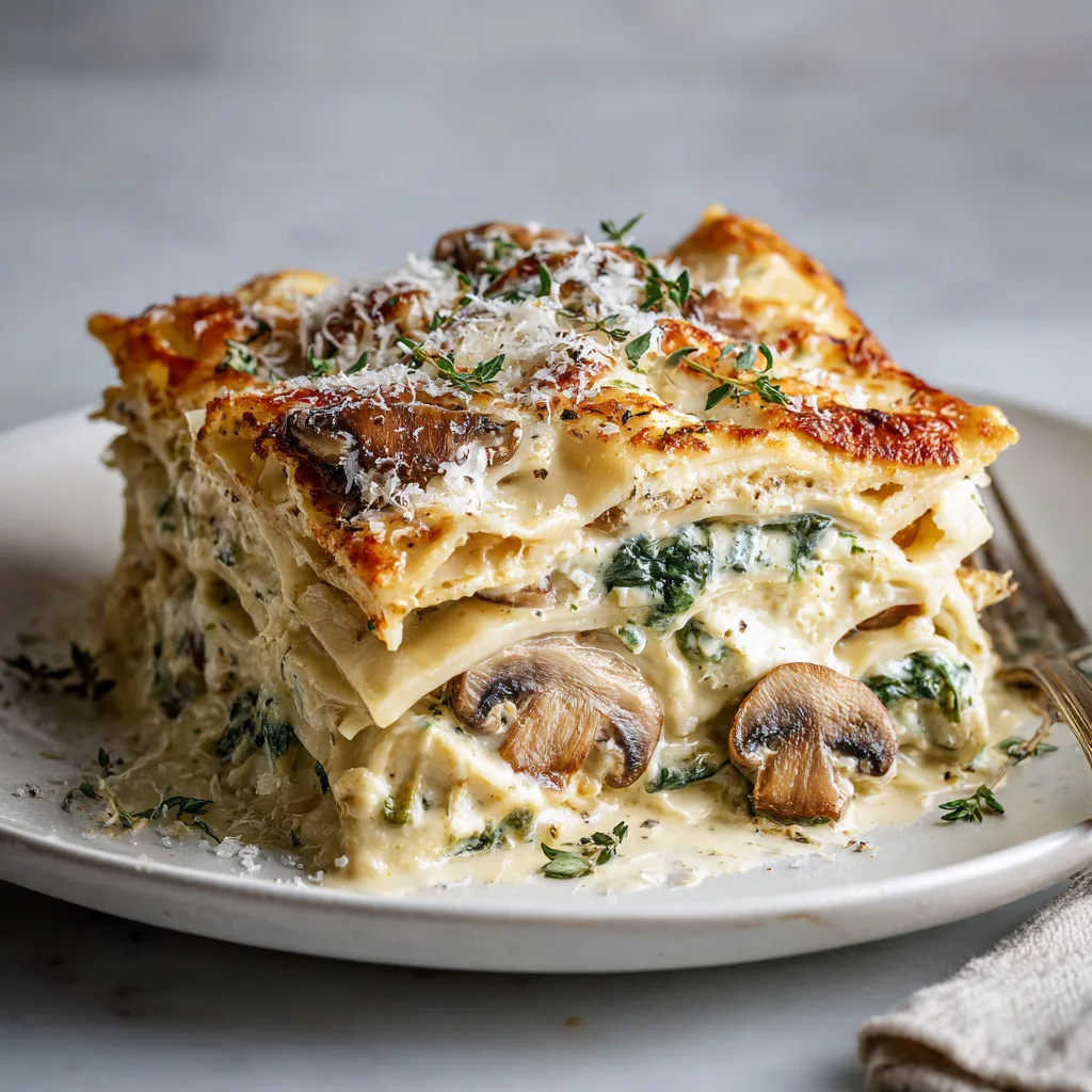 A rich, layered white sauce lasagna filled with deeply browned mushrooms, wilted spinach, and creamy ricotta for a satisfying vegetarian dinner that reheats beautifully.