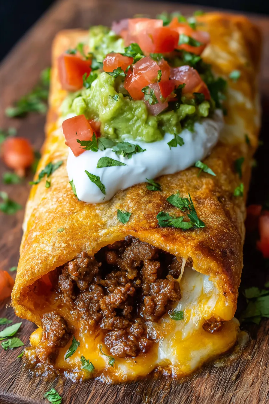Smothered version: Ladle warm queso dip or enchilada sauce directly over the finished chimichangas before adding toppings. This transforms the dish from crispy to saucy and indulgent in the most satisfying way.