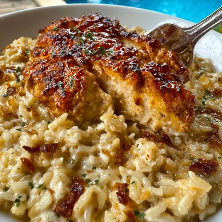 Pro tip: When you add the chicken to the dish, tuck it into the rice mixture rather than setting it directly on the surface. Chicken that’s partially submerged in the creamy base stays more moist during the long bake than chicken sitting exposed on top.
