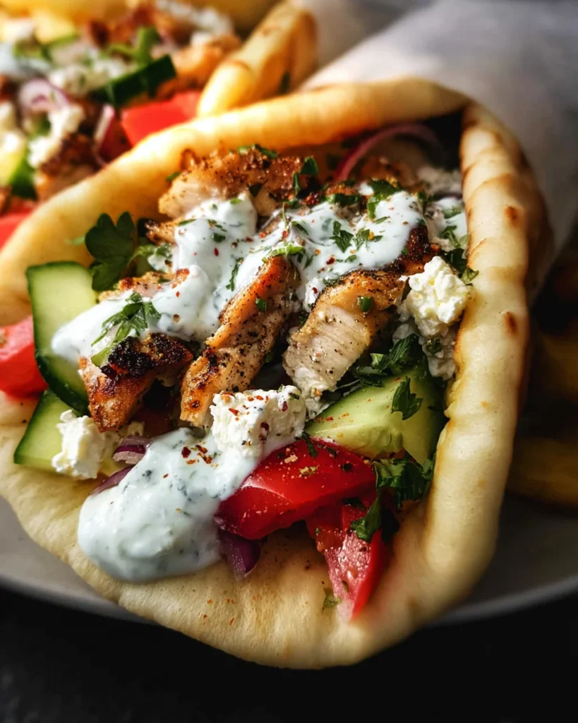 - To assemble, spread a generous dollop of tzatziki across the center of each warmed pita, reaching toward the edges rather than just the middle. Add a portion of the chicken strips, then layer sliced red onion, sliced tomatoes, and chopped cucumber over the chicken. Add crumbled feta and Kalamata olives if using. Fold the pita over the filling and serve immediately.
