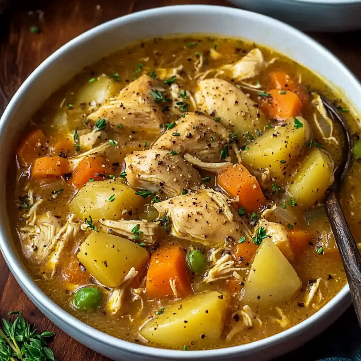 The frozen peas and the cornstarch slurry added in the final 30 minutes are the technique worth paying attention to. Adding peas at the beginning of a six-hour slow cook produces gray, mushy peas with very little remaining sweetness. Added in the final 30 minutes on high, they stay bright, sweet, and properly cooked. The cornstarch slurry added at the same time thickens the broth from a thin, sippable liquid into a proper stew consistency that coats every vegetable and piece of chicken.