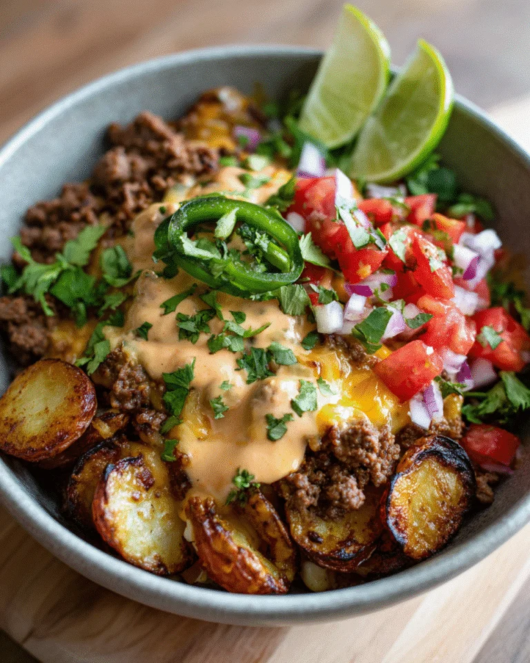 This is essentially a deconstructed taco where the potato replaces the tortilla, and the trade-off is entirely in your favor. The potatoes absorb the taco beef juices and the cheese sauce in a way that a crispy shell never manages, and the bowl format means every component stays distinct until you mix them together at the table rather than having everything compressed into a single bite from the start.