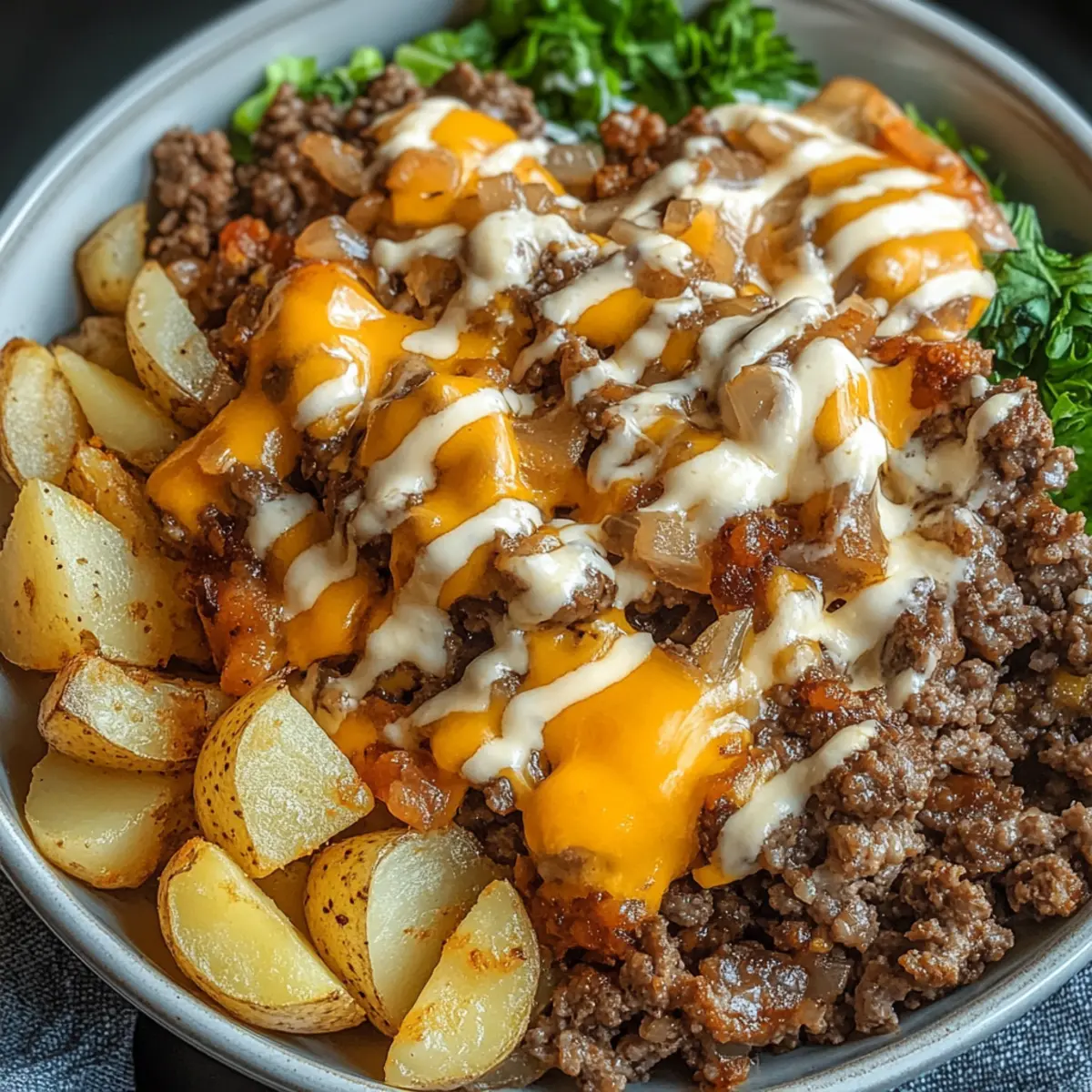Western smash burger bowl: Add crispy bacon bits over the beef layer and replace the special sauce drizzle with a combination of BBQ sauce and ranch dressing. The sweet, smoky BBQ against the tangy ranch is a variation worth building its own reputation in a household.