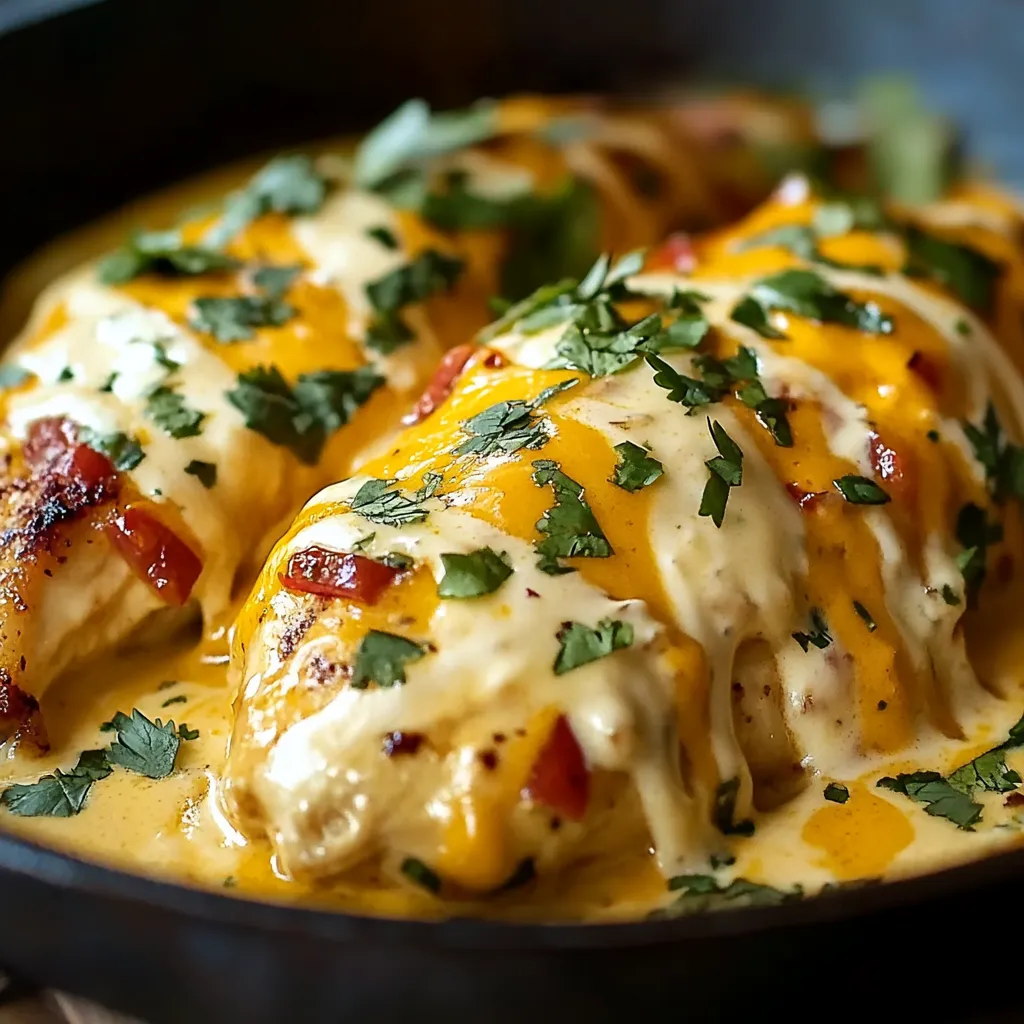 3. Pour the cheese sauce evenly over the chicken in the baking dish. Sprinkle the $1text{ cup}$ of Mexican blend cheese over the top of the sauce. Bake for 20–25 minutes, or until the chicken is cooked through (internal temperature of $165^{circ}text{F}$ ($74^{circ}text{C}$)) and the cheese is bubbly and golden. Garnish with fresh chopped cilantro just before serving.