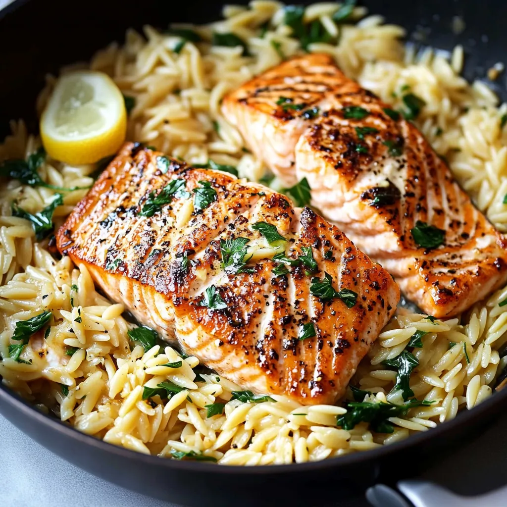 - Nestle seared salmon fillets back into the skillet, gently pressing into the orzo. Reduce heat to low and simmer together for 2-3 minutes until salmon reaches 145°F internal temperature.