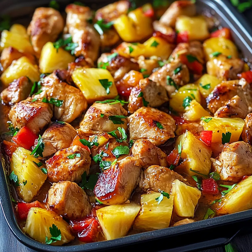 Marinated chicken roasts with sweet pineapple chunks and colorful bell peppers for a tropical-inspired one-pan dinner ready in 45 minutes.