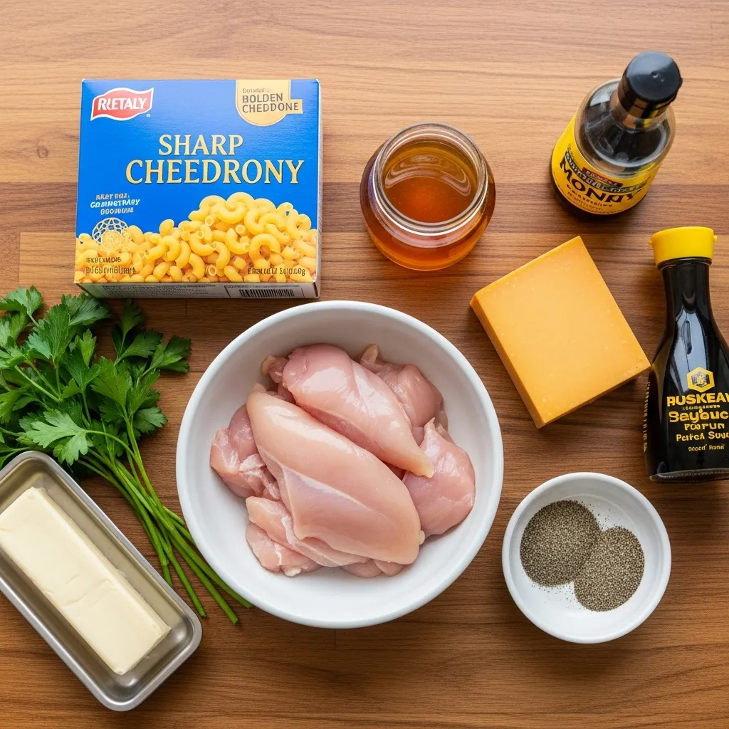 Ingredients for Sweet and Spicy Honey Pepper Chicken with Macaroni and Cheese