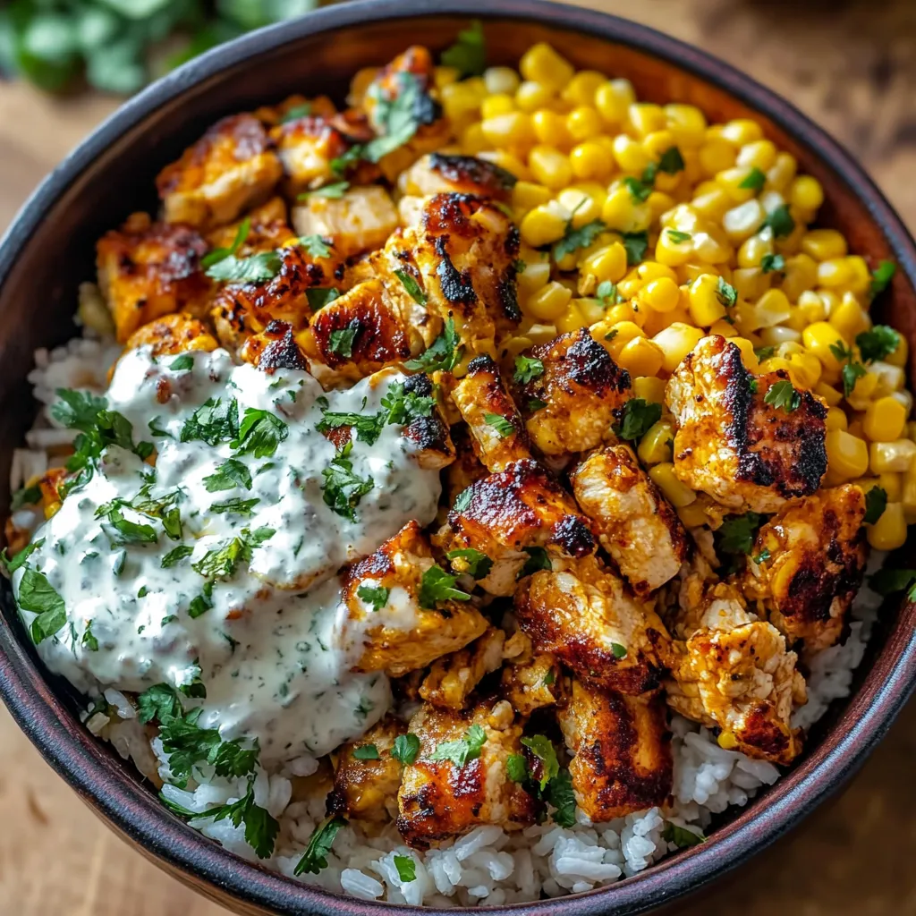 - Build bowls by adding 1/2 cup rice to each bowl. Top with sliced chicken and a large scoop of street corn mixture.