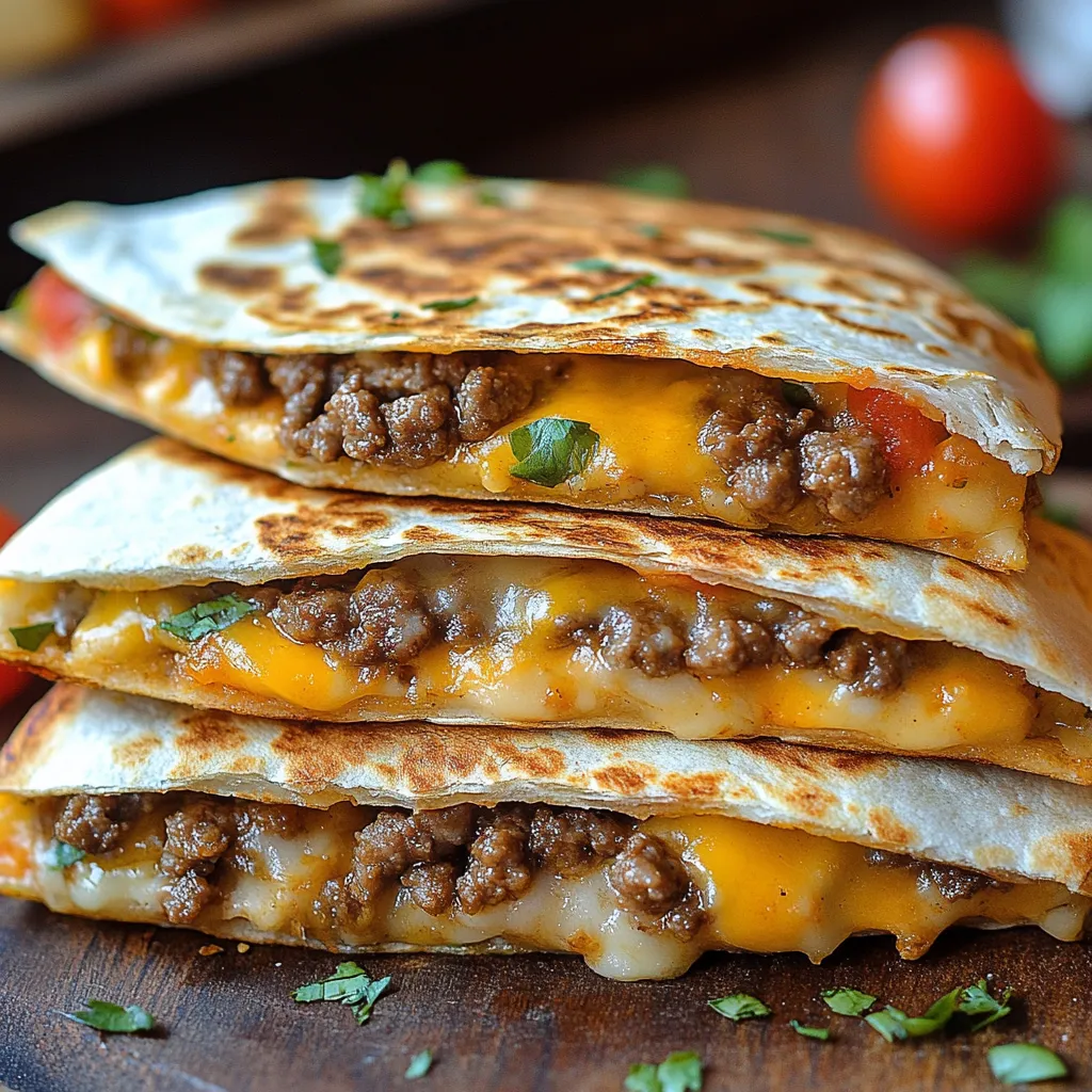 For the best results, use a cast-iron skillet or griddle and ensure it is very hot. Smash the beef firmly and thinly onto the tortilla for a crispier, juicier result. To enhance crispiness, you can brush the outside of the tortillas with mayonnaise instead of oil before grilling. Resting the quesadilla for 1–2 minutes before slicing helps the melted cheese set.