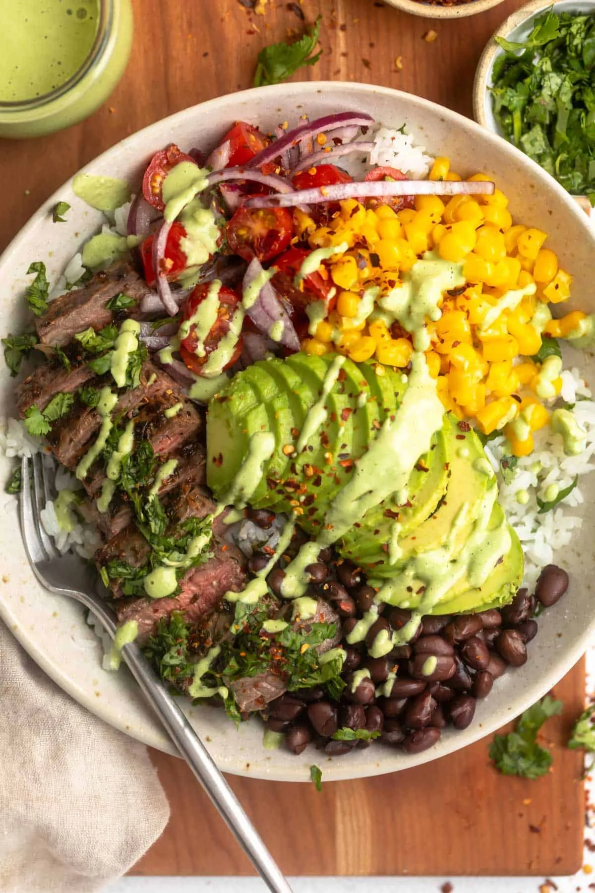 - Build each bowl with a rice base, then top with steak, black beans, corn, and avocado. Drizzle any accumulated pan juices over the bowls and finish with fresh cilantro and a squeeze of lime.